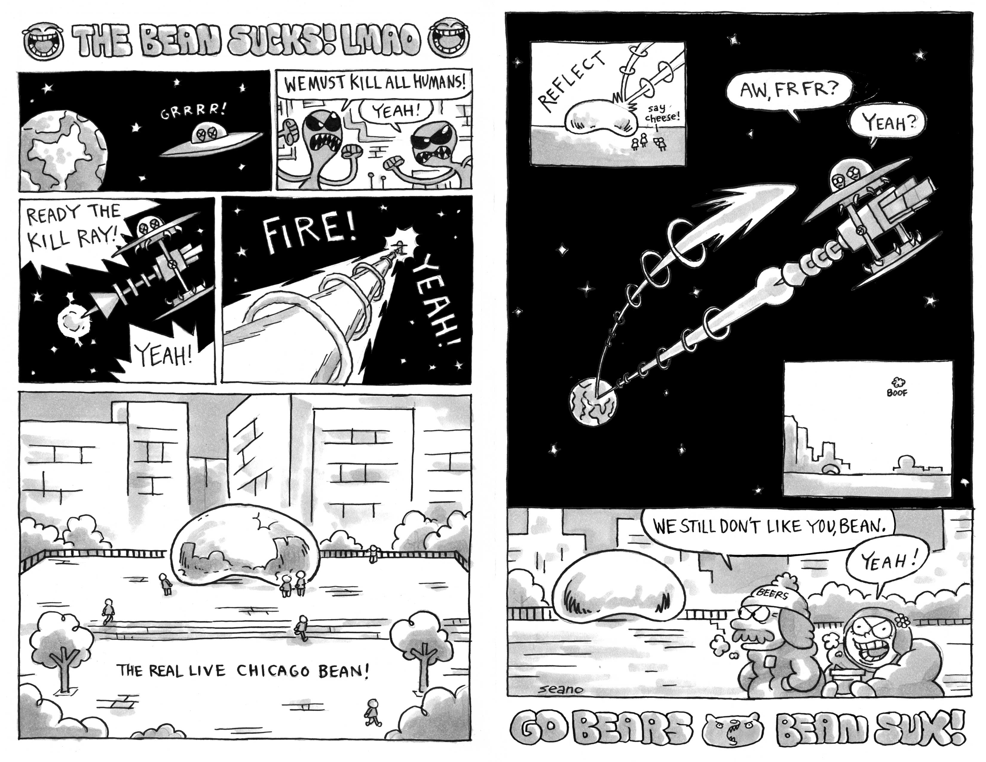 Comic about the REAL LIVE CHICAGO BEAN sucking. I don't hate the bean I just think BEAN HATE is kinda funny. MIGHT be in the Cake anthology coming out soon.
